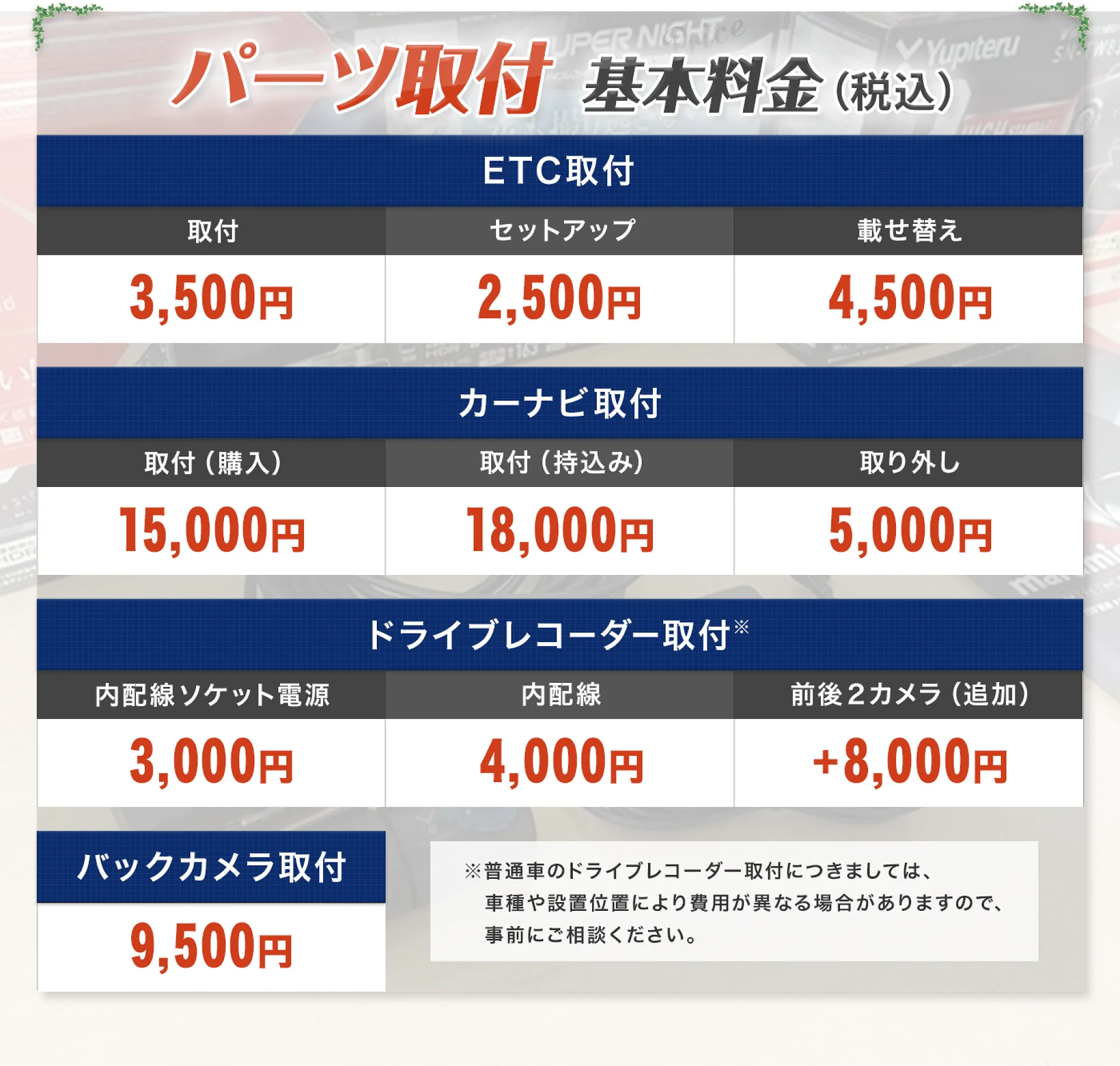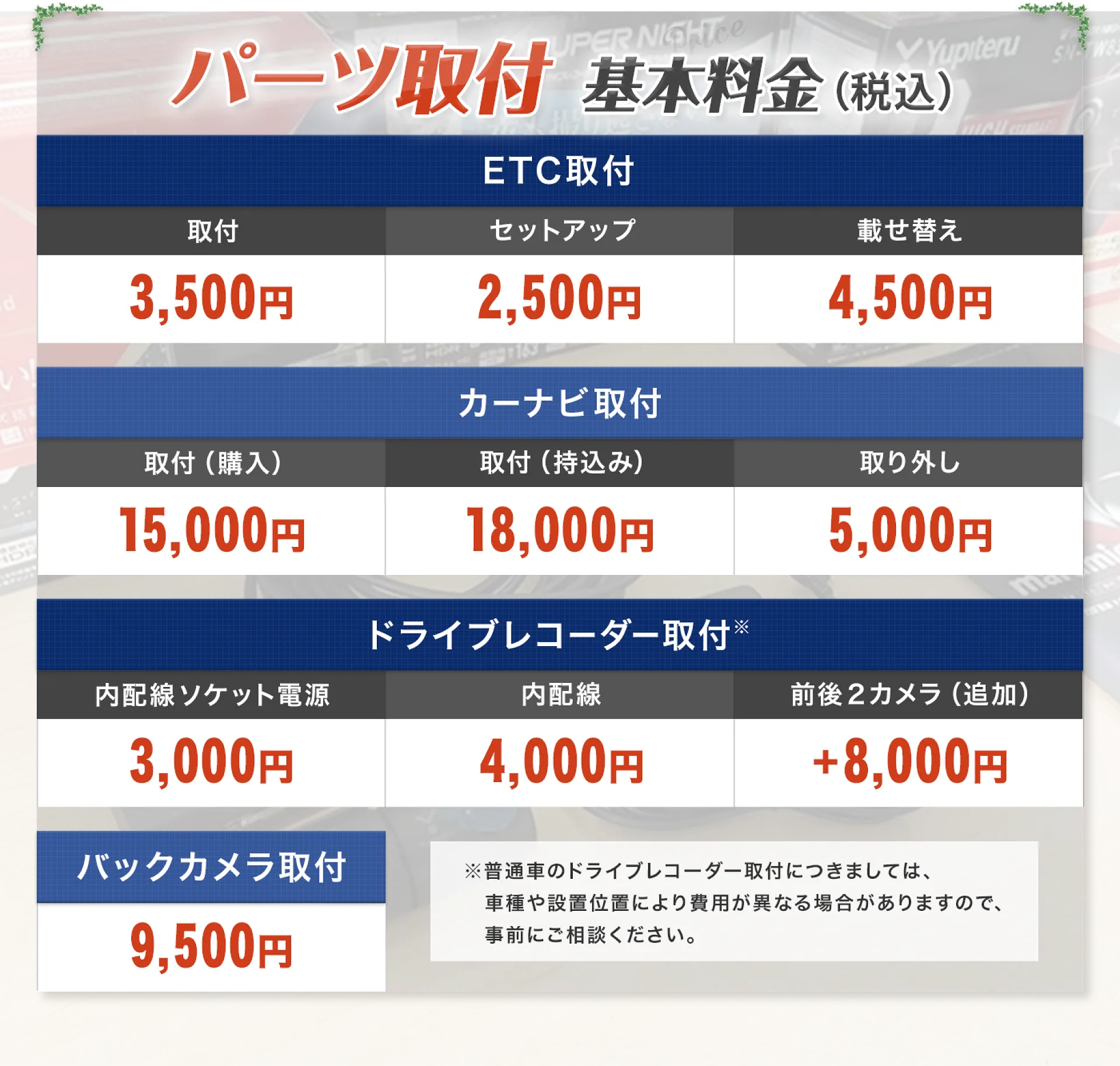 ホイールやエアロ、タイヤ交換、カーナビやドライブレコーダーなどはもちろん、他社で断られやすい内装パーツの取付まで幅広く対応いたします。