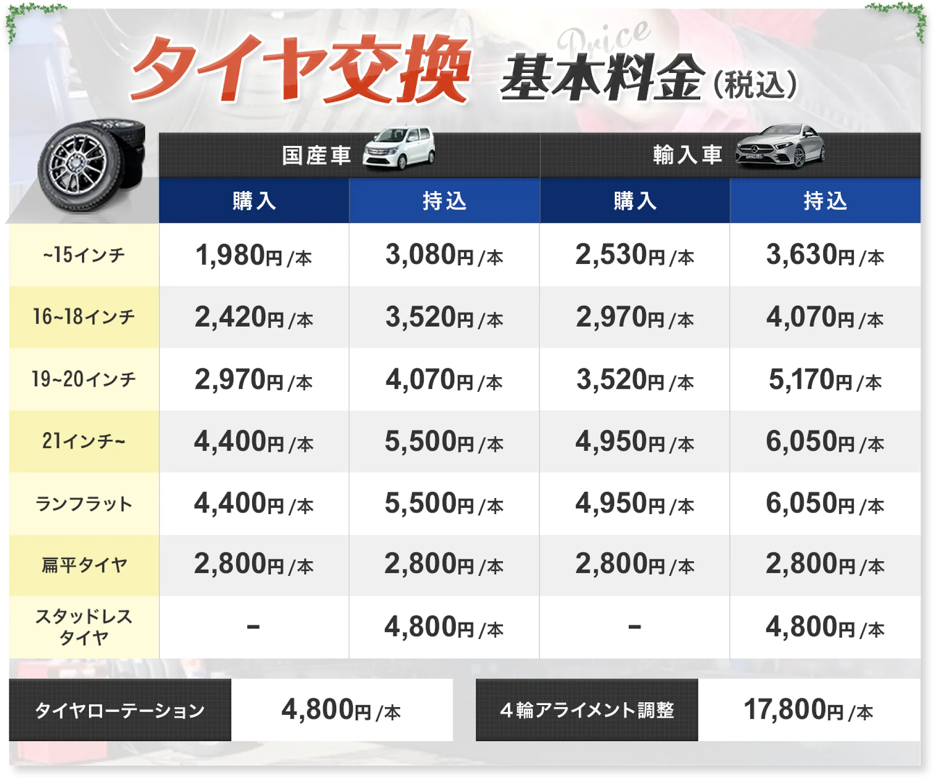 スタッドレスタイヤ⇔夏タイヤの履き替えもお任せください。