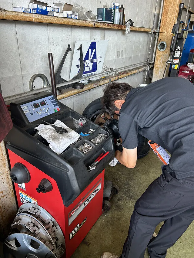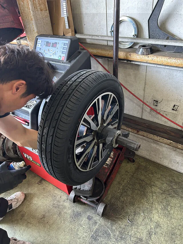 新しいタイヤを組み付けた後は、規定空気圧に調整し、ホイールバランサーでバランス測定。