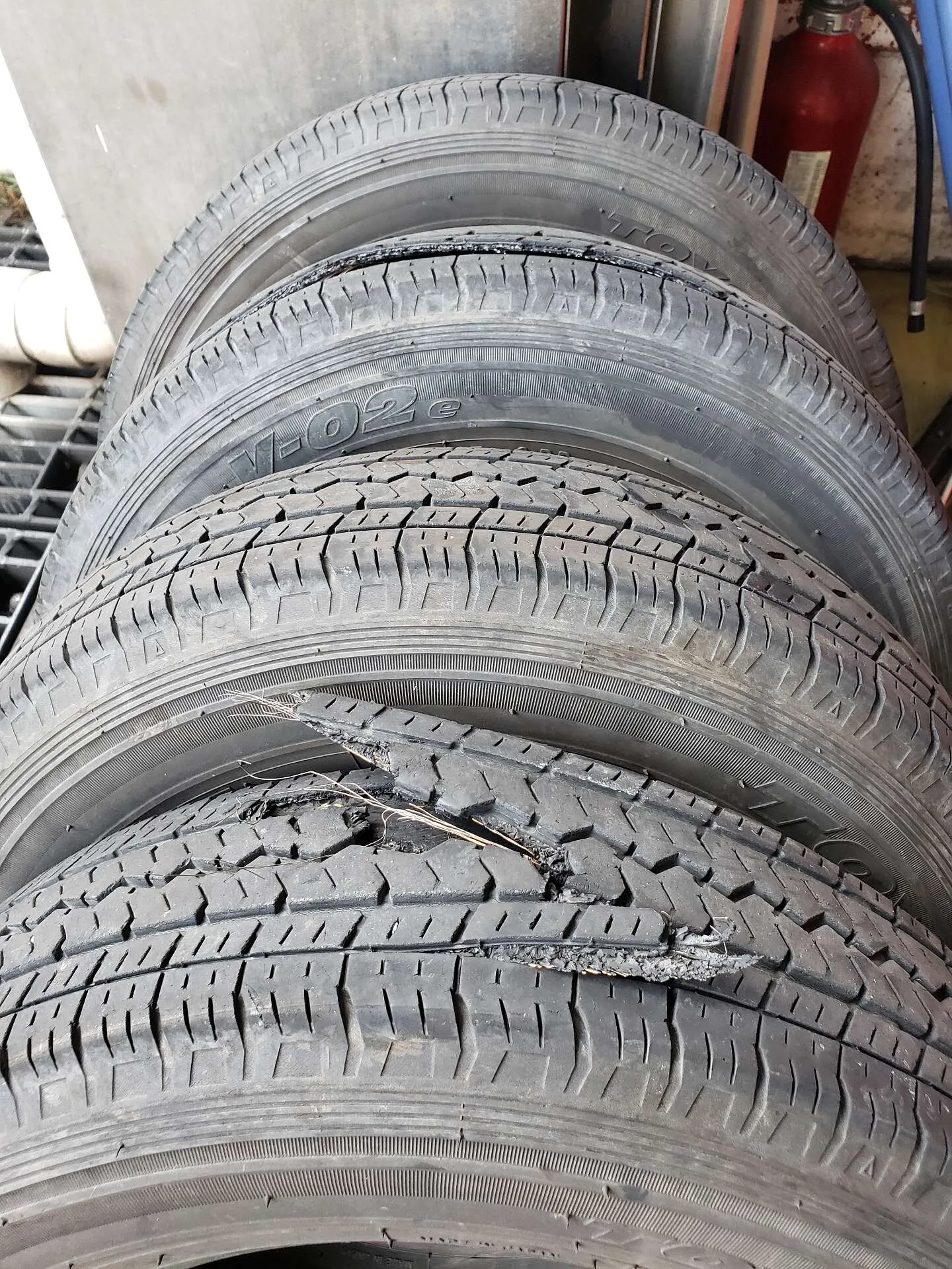 写真の通り、タイヤ表面が大きく破け、内部のスチールコードが露出している危険な状態。