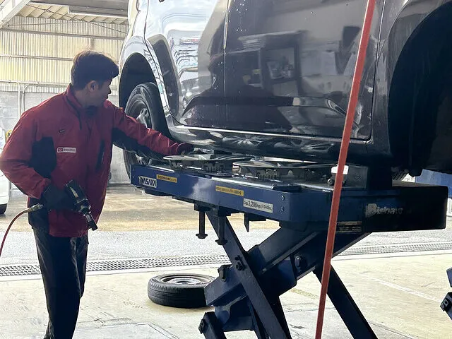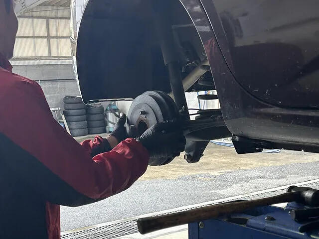 まずは車両をリフトアップし、タイヤ・ホイールを順番に取り外します。