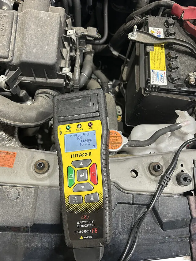 まずはボンネットを開け、バッテリーテスター(HITACHI製 HCK-601FB)を接続して状態をチェック。