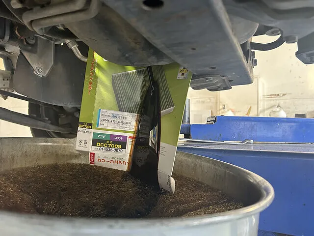 ドレンボルトを外すと、使用済みオイルが勢いよく排出され、長期間の走行による汚れや金属粉を含んだ状態であることが確認できました。