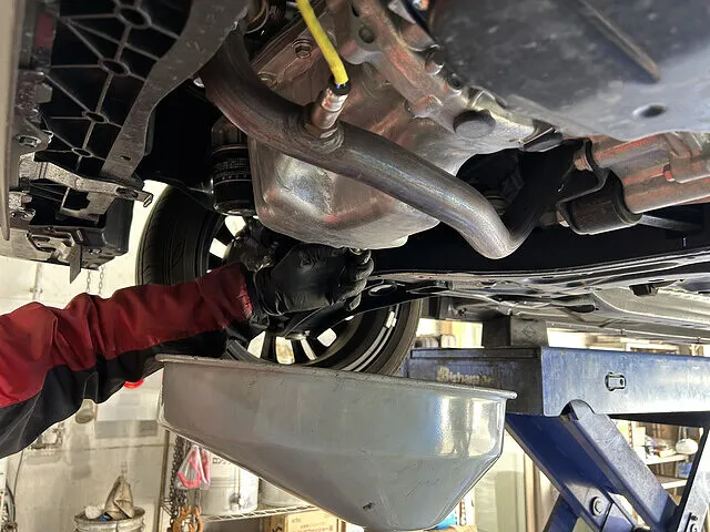 写真の通り、オイルパン下に受け皿を設置し、確実に排出できるよう慎重に作業を進めました。